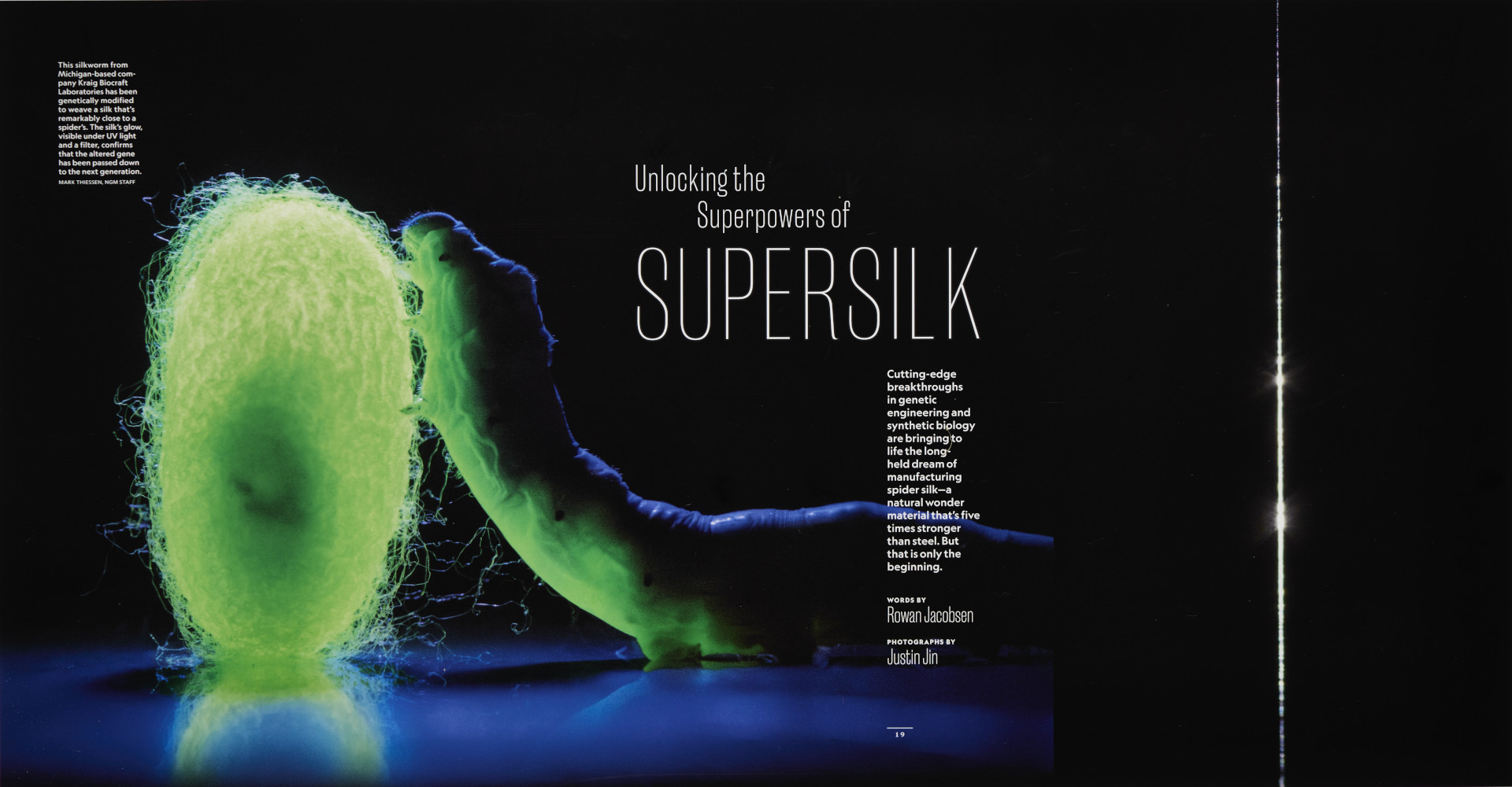 Kraig Labs hosted a team from National Geographic at the Company’s research center for three days of interviews, facility tours, and photography. That visit resulted in the striking cover image and an in-depth feature exploring the science and progress behind next-generation spider silk materials. During their visit, Kraig Labs recombinant spider silk was put to the test, towing a car across a parking lot and suspending a person from the ceiling on a single 0.35-ounce loop of thread.